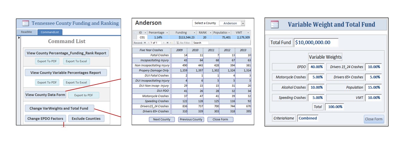 State agencies such as Tennessee Governor’s Highway Safety Office (GHSO) work with the National Highway Traffic Safety Administration to implement traffic safety enforcement programs focusing on occupant protection, impaired driving, speed enforcement, truck and school bus safety, pedestrian and bicycle safety. The objectives of this research were to develop the traffic enforcement ranking and funding criteria as well as a tool that take into account several variables in allocating annual grant for traffic enforcement. The variables that were considered include county crashes (Equivalent Property Damage Only, injury severities, alcohol related, speeding related and motorcycle related), population, vehicle miles of travel (VMT), and the crashes involving young and senior drivers. The developed tool was based on Microsoft ACCESS database with the capability of generating reports in PDF or Excel files
